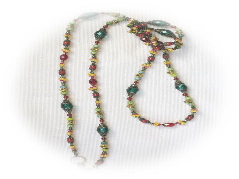2本のテグスを使って、 たくさんの種類のビーズを 通していきます。 オリエンタルな色彩が魅力。 1連・2連にしてネックレス、 又は5連にして ブレスレットとしても使用出来ます!
