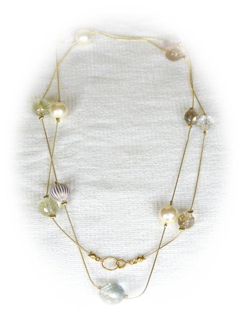 1連・2連どちらでも使えます。 細いチェーンに大きいビーズを通し、つぶし玉で固定します。 夏にオススメの作品です!