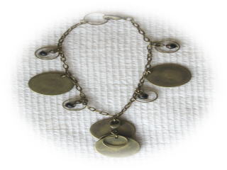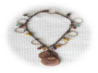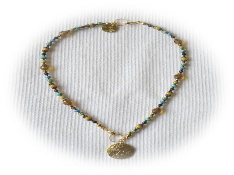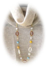 水色や黄色の大きいビーズを 9ピンでつなげていきます。 ジーンズに良く合うポップな作品です。 チェーン部分で 長さを自由に変えられます。