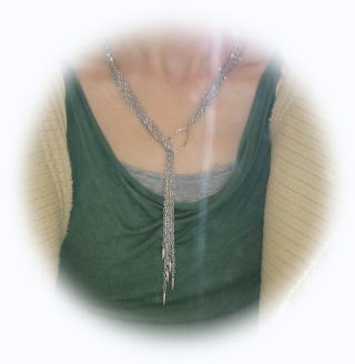 細いチェーンを5連にして、 Y字に仕上げた作品です。 中央部分は固定してあるので、ずれません。 動いたときにチェーンが サラサラする感じが涼しげです。 ビーズは使用せず、 チェーンと金属パーツのみで 仕上げます。