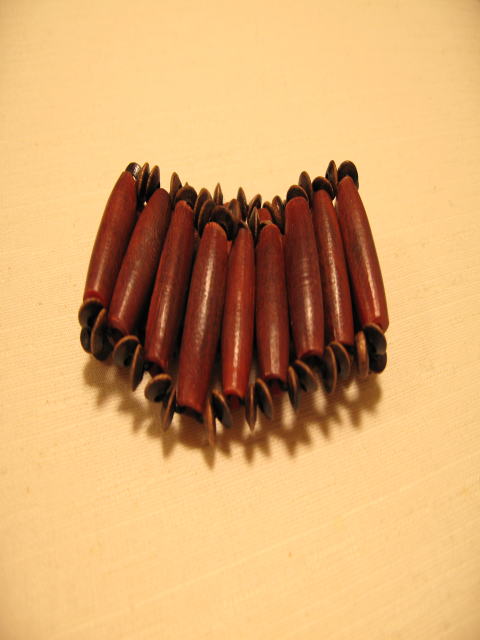 | 3. ウッドビーズのブレスレット。ゴムに通してあるので、 手首に通すのがラク! このウッドビーズも最近見かけなくなりました... |